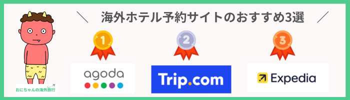 おにちゃんよく「海外ホテル予約サイトはどこがいいの?」と聞かれるのですが、私自身は「agoda」「Trip.com」「Expedia」をおすすめしています。