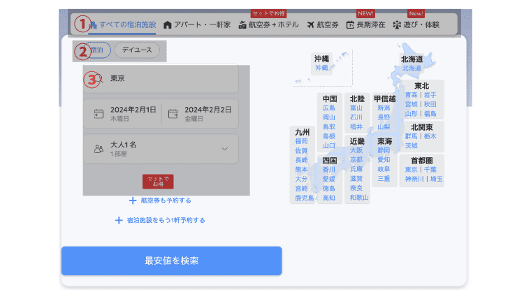 - 目的地・チェックイン日・チェックアウト日・人数・部屋数を選択