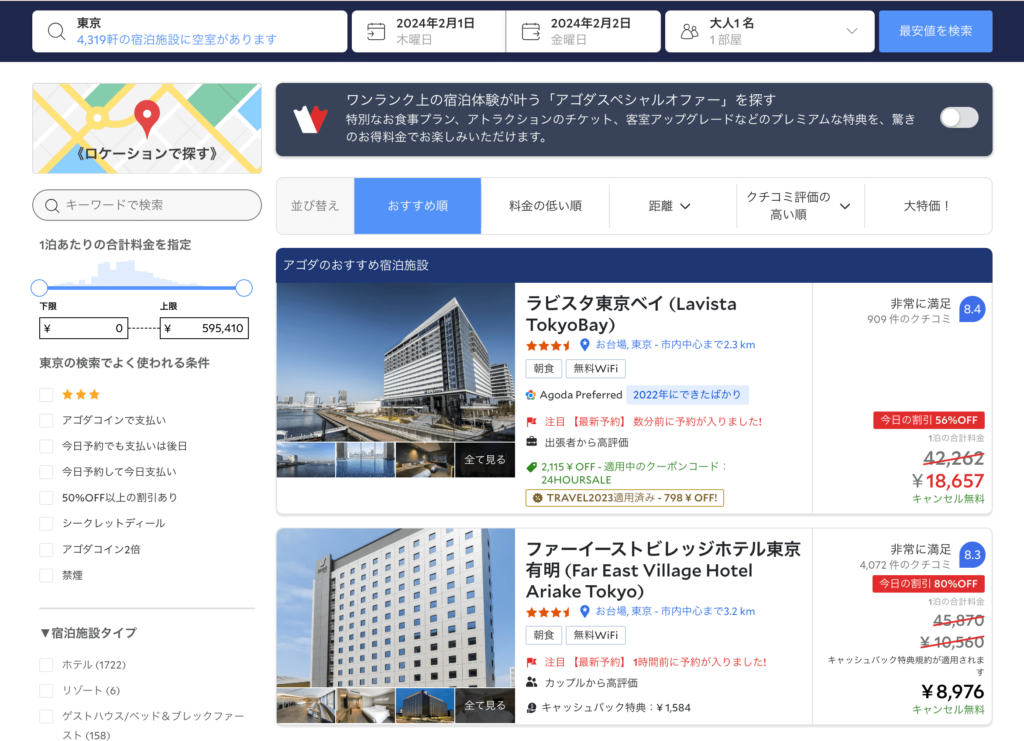 Agodaは世界的にも人気のある予約サイトなので、検索結果に表示されるホテル数は膨大です。