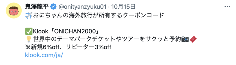 現時点では、あまり良いKlookのクーポンコードがないので、おにちゃんの海外旅行で発行されている最大6%OFFの割引クーポンコードをお使いください。