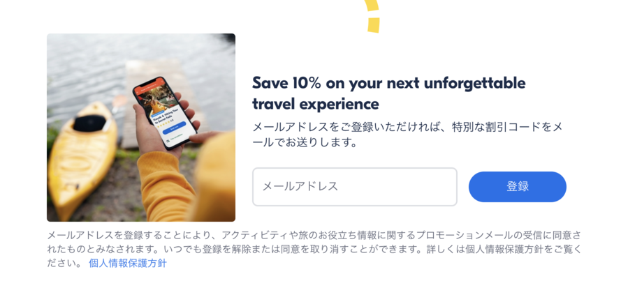 現在、GetYourGuideでは、旅行体験の10%割引されるクーポンコードを新規利用者に発行しています。