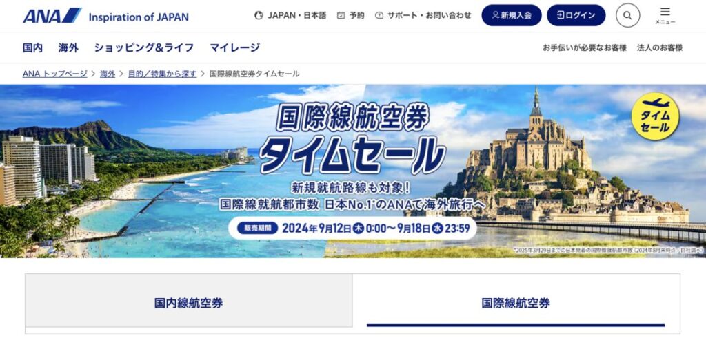 特に「ANAスーパーセール」などの大型セールでは、国内線や国際線の航空券が大幅に割引され、通常よりもお得に購入できます。