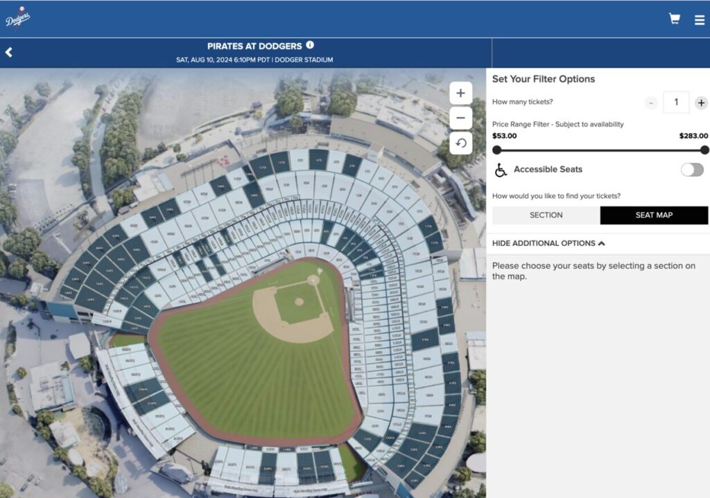 次に、ドジャー・スタジアムの座席表が表示されるので、予約可能な席を選択しましょう。