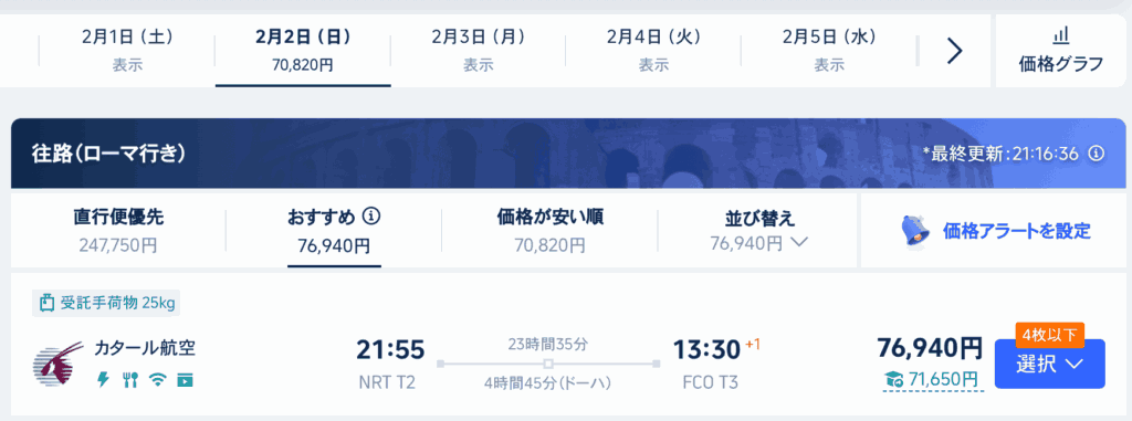 私が成田からローマへ行く際に見ていた金額は「片道78,000円」でした。