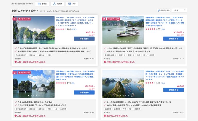 日本人の多くが利用している予約サイトの中で口コミや人気順で評価が高かったハロン湾ツアー商品を厳選して紹介していきます。